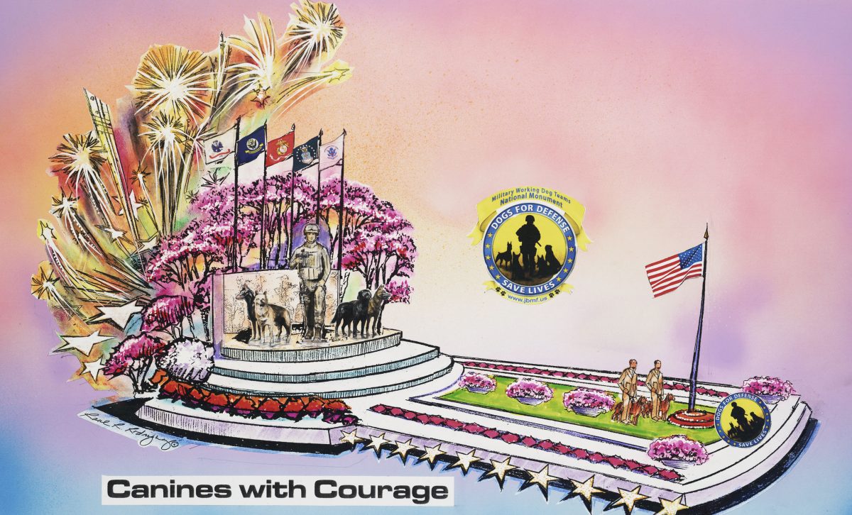 The public will get a sneak peak of the monument at the Tournament of Roses parade in Pasadena on Jan. 1, when a floral replica will be used as Natural Balance’s float. Burnam, dogs and handlers from every military service branch will ride on it.