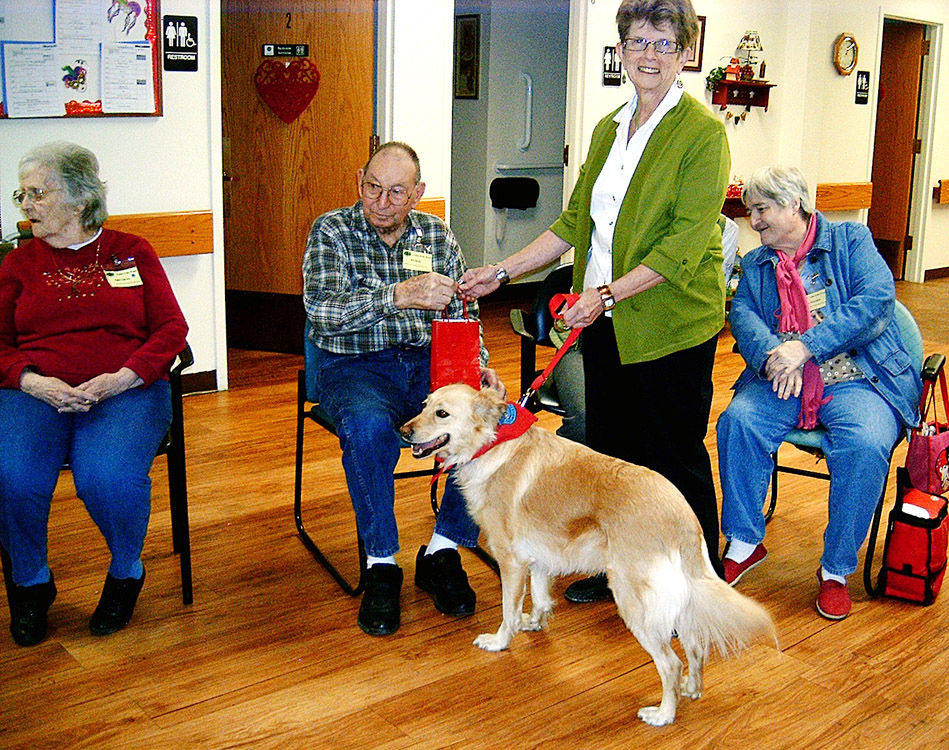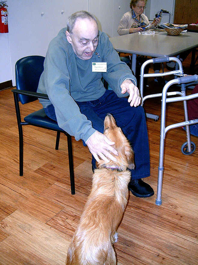 Fayette Friends of Animals and Karen Novak bring a registered pet therapy dog each month to the Adult Day Center at Center in the Woods in California. Above, Sara Clowes, Ed Short, Novak and Linda Yetsconish enjoy a visit with Angel. At left, Eugene Greco enjoys visiting with Penny.