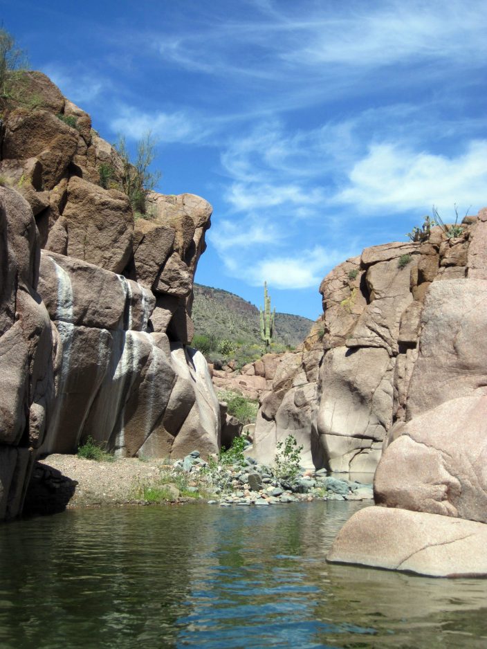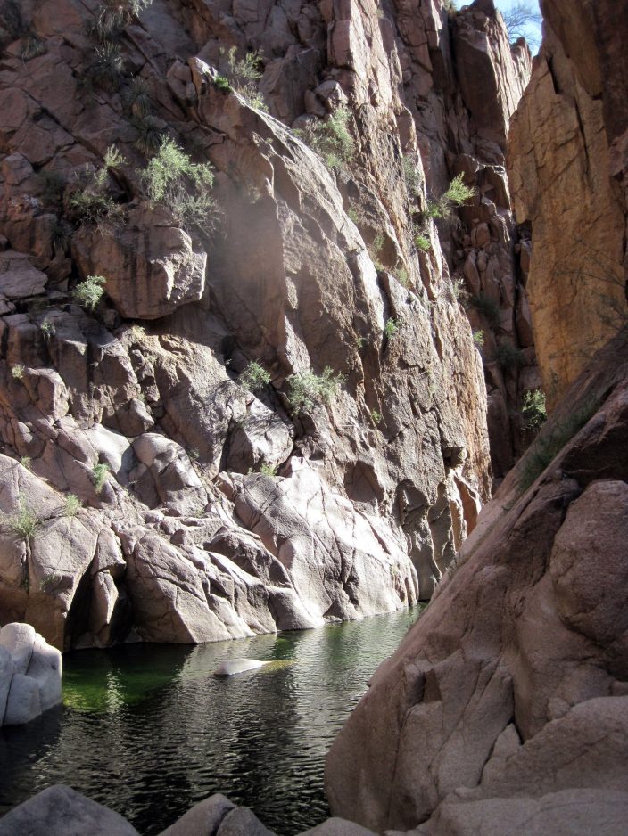 The Arizona desert sun, which often feels hot enough to fry an egg on concrete, turned deceptive as we headed down, sometimes glistening on the water, sometimes hiding behind rock peaks and leaving the creek in dark, chilly shadows. The water temperature was a cool 59 degrees, and the chill intensified when we approached a small waterfall. The only way down was to channel our Spider-Man senses and attempt to latch onto the slabs of rock face buttressing the waterfall before we shot down the gushing water into the creek. Shouts of “Wheee!” soon turned into “Aaaah! It’s freezing!”