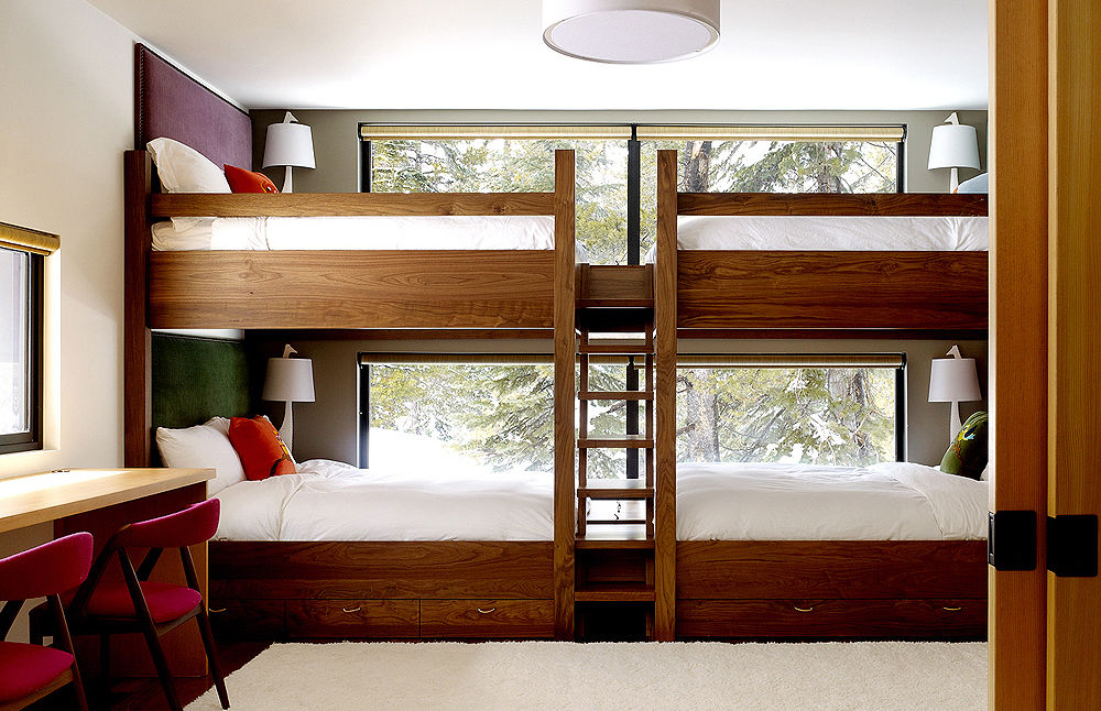 Wood bunkbeds designed for the kids’ room repeat the square-block, linear design of the building; the white bedding and cozy textured white carpet blend seamlessly with the snowdrifts outside, while color is presented in splashes of winter cardinal red on cushions, fuchsia desk seats and a purple wall panel.