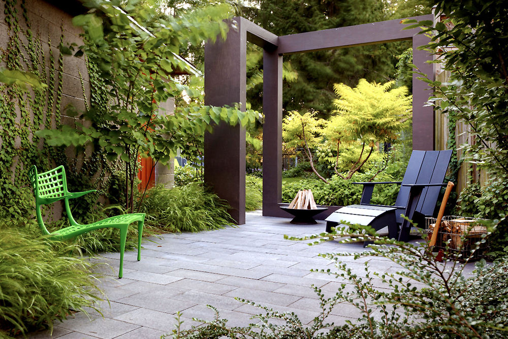 Where privacy is not an issue, rather than building a solid wall, you can define garden spaces with an oversized wood frame as Earth Inc. did for a second city garden that was long and narrow. The frames are built with pressure-treated wood clad in MDO, which is similar to MDF, but for exterior use, and stained a dark gray. The L-shaped structure acts as a focal point designed to draw your eye in two directions – into the back garden where a tiger eye sumac catches the morning sun, and to the left and the entrance to the garage through a bright orange door. Urban fire pits are very trendy now, but be sure to check your local fire codes before lighting any fires. High-end garden furniture is pricy, but you may want to splurge on one great chair or lounger and then fill in the gaps with more affordable solutions.