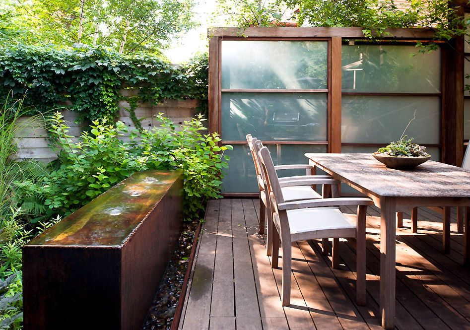 Water features are a garden feature that remain popular, but be advised that they do require maintenance. Circulating water requires a pump, and the water vessel will need to be emptied and cleaned in the winter months. They are a soothing addition to any garden or deck as long as they are designed in such a way that the sound of the water is controlled and subtle. In this city garden, a water feature is built with three spouts. The concrete basin sits in a long, Corten steel trough along the perimeter of the deck. Corten steel weathers through oxidation to a rust-colored appearance, creating a protective coating that resists corrosion. By combining old and new built-in features with ivies and lush greenery, this garden is a haven during the day and long summer evenings.