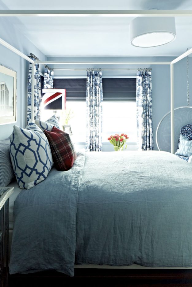 Flynn uses deliberate contrast to point up that casual feeling: “I like to juxtapose super-relaxed elements such as slipcovers or bedding made from washed linen with super-tailored elements such as tailored tartan or pinstripe accents. The result is preppy, but still casual.”