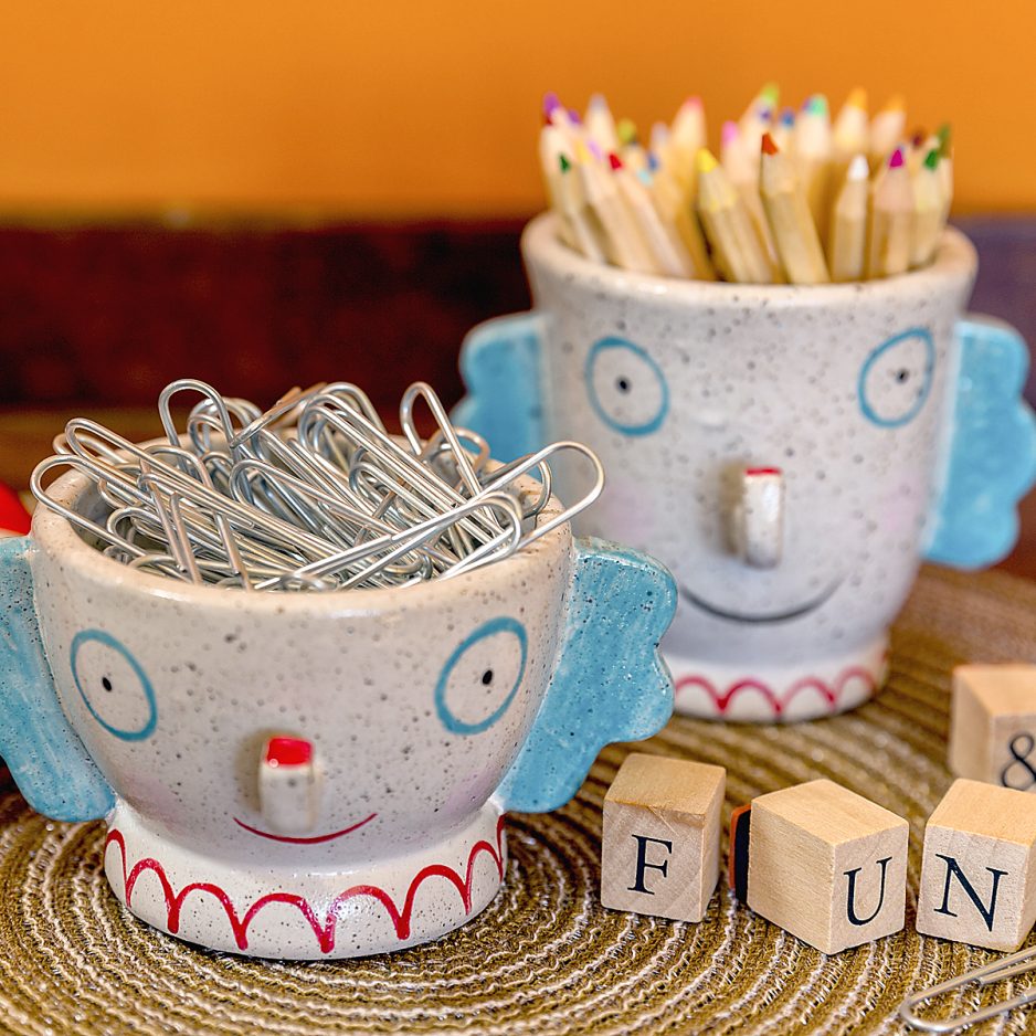 Some of these projects are featured in my book “Kids’ Rooms.” Stained glass hoops were always a hit; these colorful circles hung in their bedroom windows. Tapestry hoops comprise two circles, one slightly smaller than the other. Instead of fabric, I used pieces of colored acetate to make reflective windows of color that dance in the sunlight. Stenciling designs on fabric or walls is easy and makes us all feel like grand artists. Decoupage, which is cut-and-paste art, is a captivating way to build a picture or cover a plain cardboard box to make it special. There are lots of ideas for containers to hold paintbrushes and colored pencils that are artsy and fun all on their own. You can find the Kooky Ceramics shown here online at www.kookypottery.com, and in a few years you just might be making some of your own. Enjoy this special time with your children; invite the neighbors in, too.