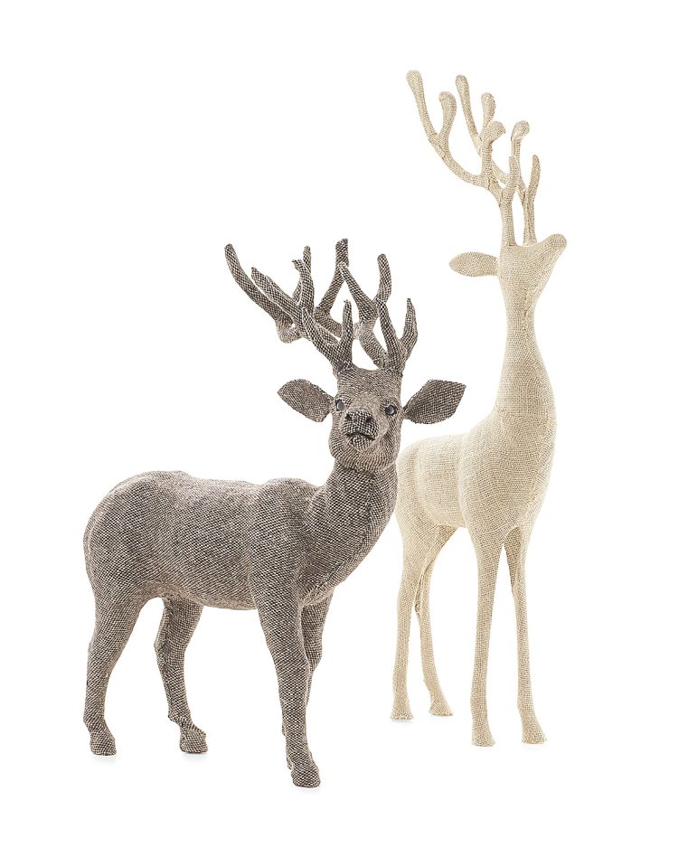 The 1920s inspire a lot of holiday décor, with West Elm offering glittery Art Deco letter ornaments and star garlands, as well as Deco-patterned, mercury-glass hurricanes in silver and midnight blue. Elegant, gold, blown-glass animals fit the vibe.
