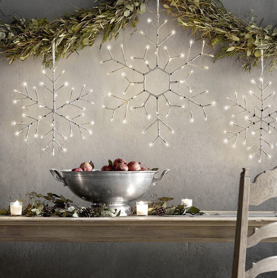 Clusters of string lights look gorgeous under glass cloches; Restoration Hardware offers both in various sizes. And snow globes that send up a flurry of up-lit flakes with the push of a button are a twist on the traditional.