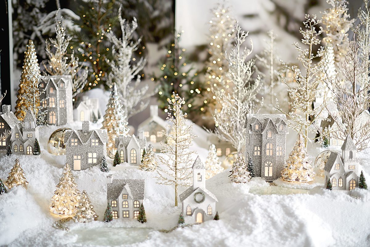 Throw pillows and signs printed with a vintage-style chalkboard Christmas greeting hold charm at Pottery Barn, where the design is also available in a door mat. Here too, a decorative collection of old-fashioned village homes, churches and schoolhouses evokes turn-of-the-century German ornaments similarly made of cardboard and silver glitter. Purchases from the collection support shelters nationwide through the Give a Little Hope organization.
