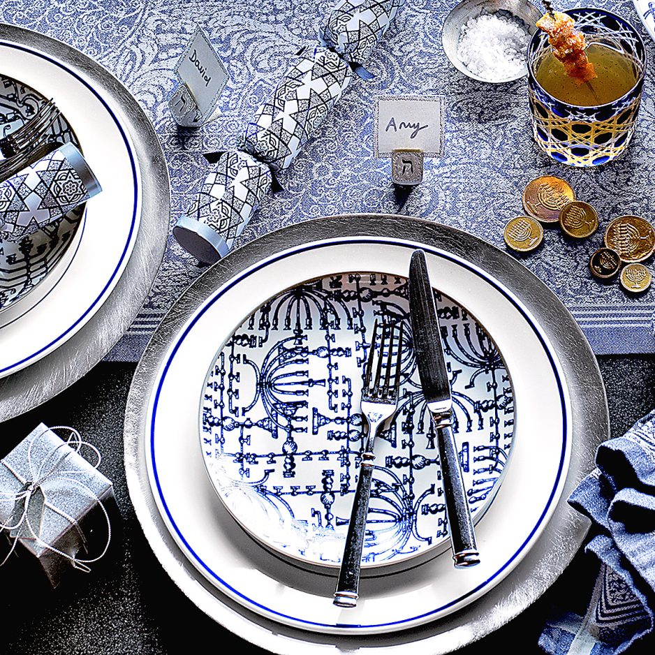 For Hanukah, Jonathan Adler offers a blue, Lucite cube menorah, as well as an array of mod, ceramic-animal menorahs. At Williams-Sonoma, a collection of porcelain plates and serveware in cream with a graphic print of ancient temple menorahs would add style to a holiday buffet.