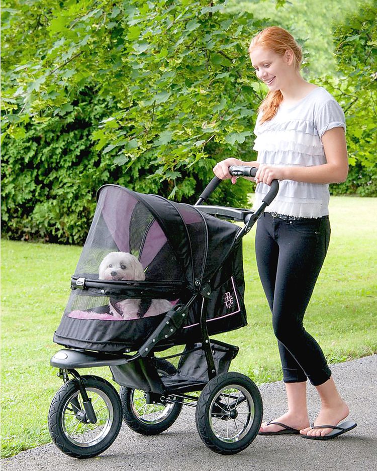 Adjustable wheelchairs and body harnesses are available at www.k9carts.com . Go for a walk or jog with a pet stroller; many are equipped with weather screens, and some with removable carriers or space for more than one furry friend. (www.theuncommondog.com)