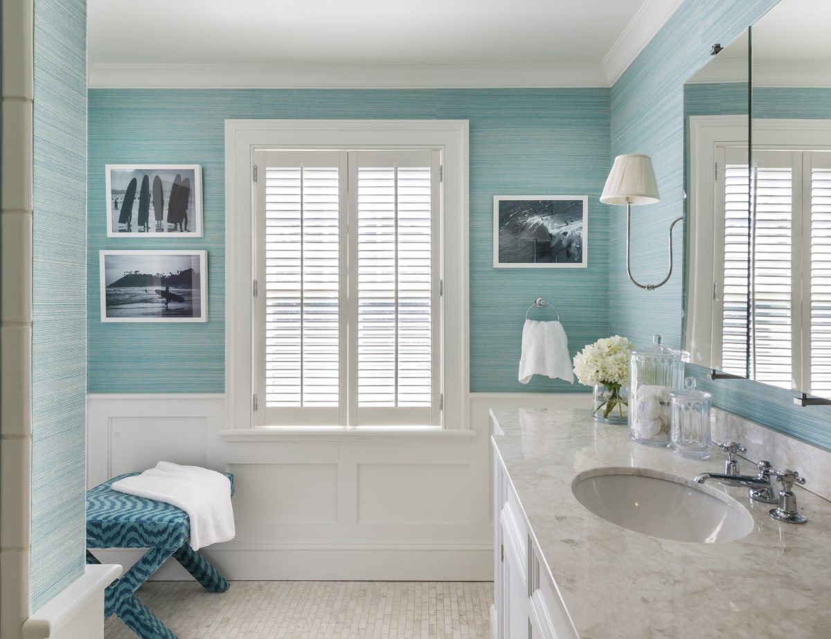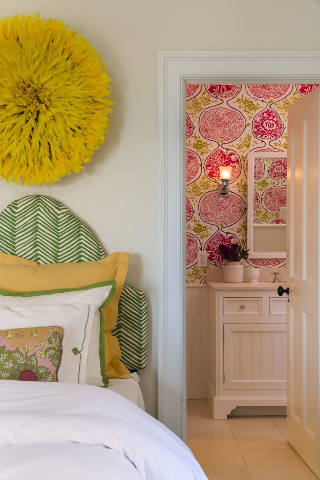 While decorating the bathrooms in a client’s home, Jackson suggested striking wallpaper that “made these ‘vanilla’ rooms sing.”