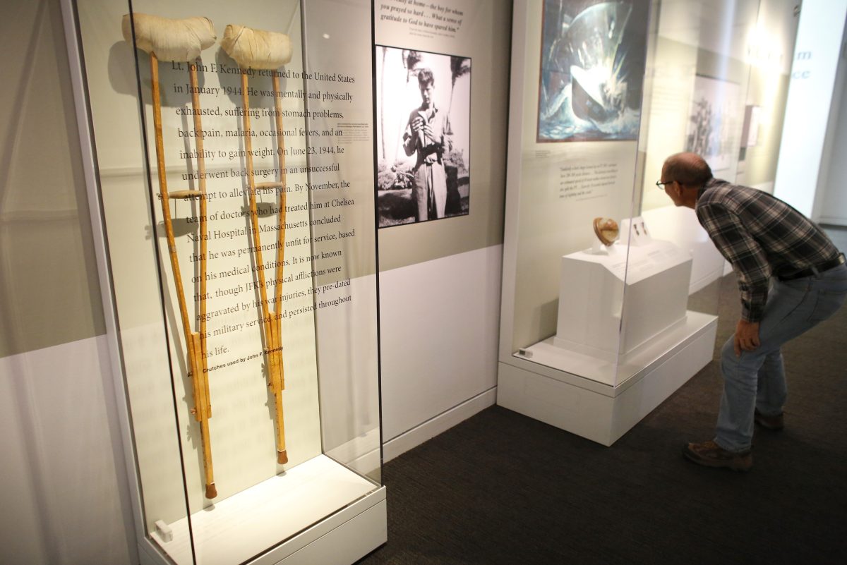 The exhibition also focuses on Kennedy’s service in the Navy. Kennedy was the commanding officer of the patrol torpedo boat PT 109 that was rammed and sunk by a Japanese destroyer in August 1943 off the coast of Australia.