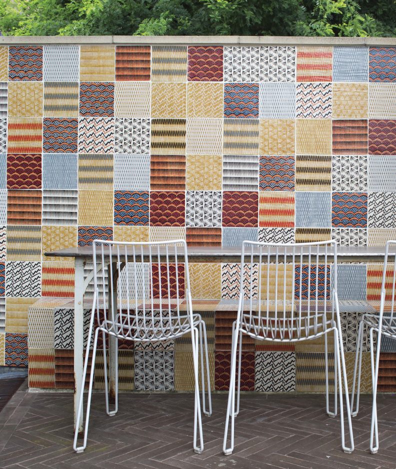 Elsewhere, tiles give spaces a clean and contemporary feel. A Heath design featuring cubes in gray-blues and reds adds depth and character to a study wall, and in a garden in Sao Paulo, Brazil, graphic tiles with an undulating design in blue and white (designed by the Athos Bulcao Foundation) add a fluid, modernist touch.
