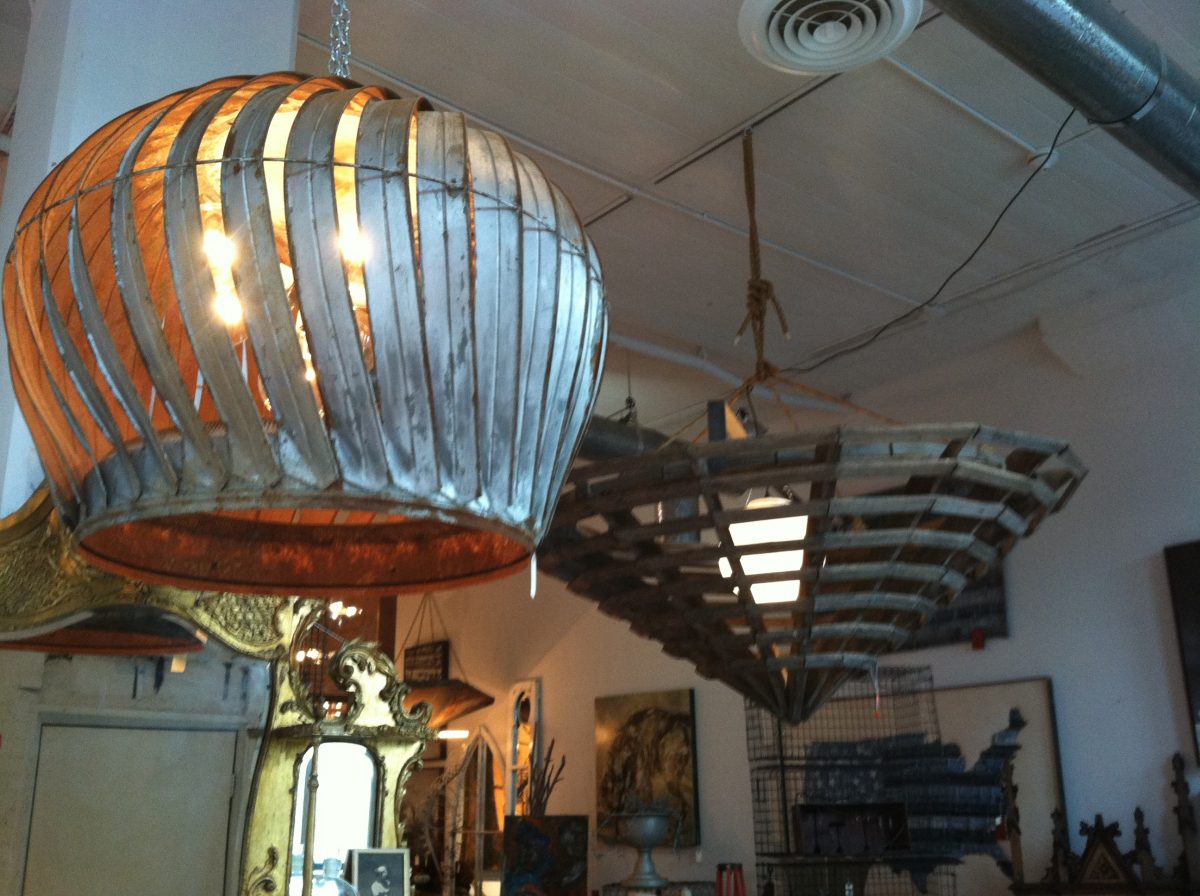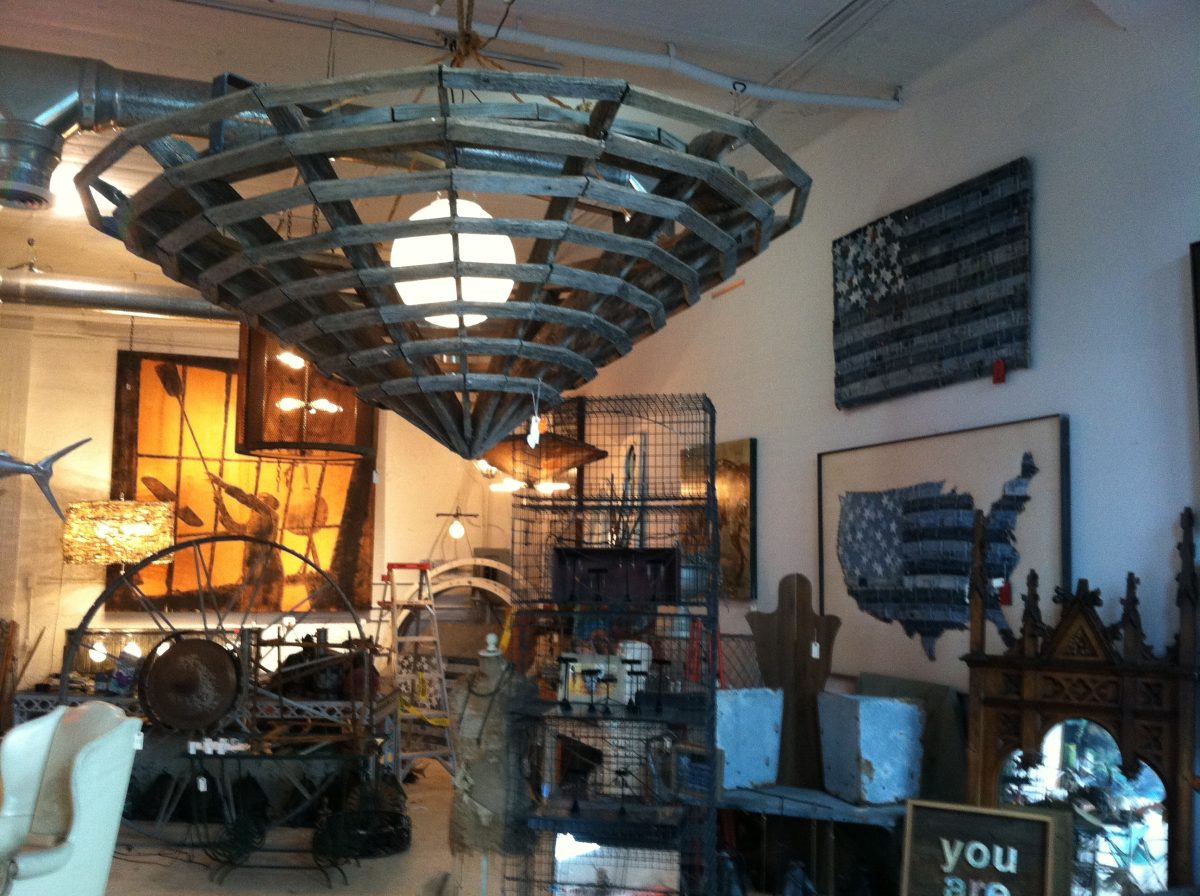 Nicholas started his lighting business about 15 years ago “making lamps out of found architectural pieces” like distressed porch balustrades with turned wood and layers of paint. At one point, he was making hundreds of upcycled lamps, selling them wholesale to a furniture market and a retailer. But eventually he got bored with smaller fixtures and now concentrates on larger, unique pieces, which can be seen on his website http://www.splurgedesign.com and in his showroom, Splurge, in Asheville’s River Arts District.