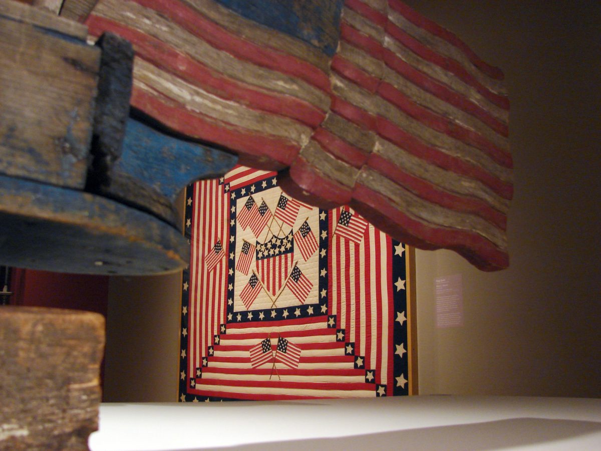 A patriotic-themed quilt, along with an Uncle Sam whirligig, greet visitors to “American Made.” Quilts adorn several galleries, including one from the 18th century that features the name of the quilter – Maria Cadman Hubbard – as boldly as admonitions that include “Forgive as you hope to be forgiven.”