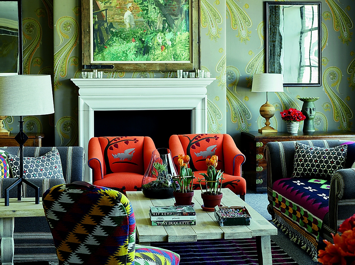Folk art is a vibrant theme that runs through Kemp’s work. She explains that “folk art covers a multitude of skills, from painted ceramics and decorated travel chests to intricately woven bed linens and pictures. They have all been made with gentle hands and big caring hearts. They have soul.” Kemp has designed a collection of furniture and wallpaper for lifestyle and fashion retailer Anthropologie. Her favorite piece is the Winged White Rhino armchair with flying monkeys dancing around the bright orange base and contrast piping in bright blue. The White Rhino, an endangered species, has wings to save it from its enemies. In the sitting room shown here, these delightful chairs are surrounded by richly textured woven rugs, some used as throws, and above the mantel, a custom frame with a hinge detail.