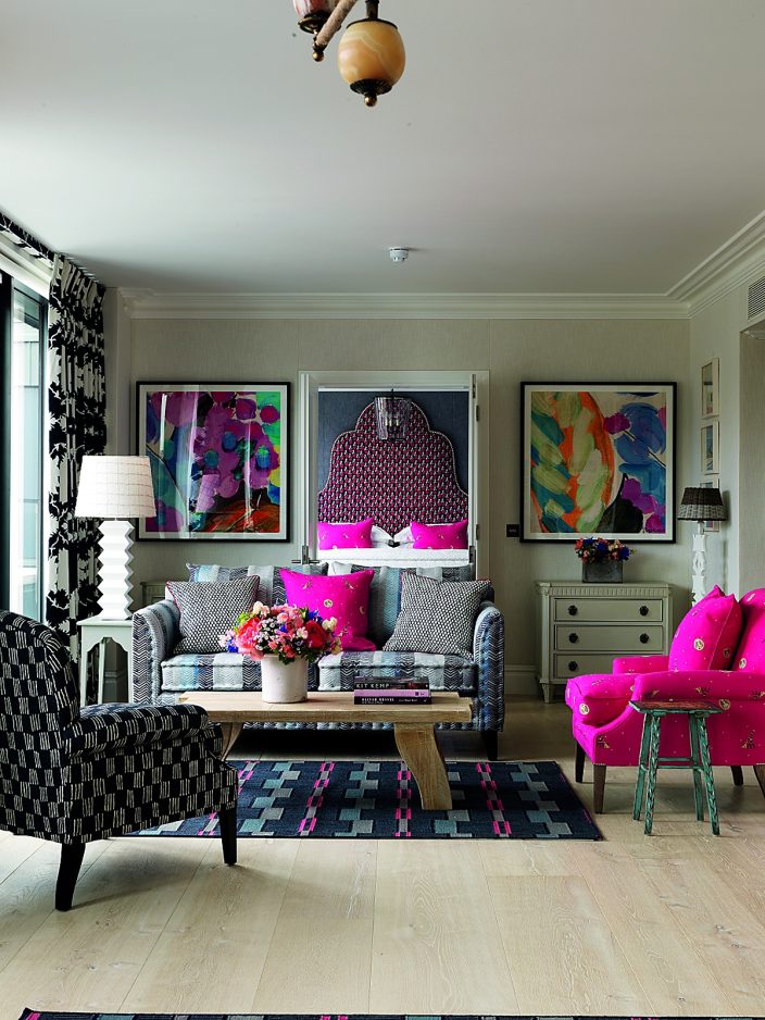 Kemp has modernized the British look for comfort in traditional homes by making them bright and cheerful with an eclectic mix of fabrics. Comfort is a priority for Kemp, and you will see that her sofas and chairs are plump and inviting. Whatever the upholstery fabric, it must be soft and pleasing to the touch. There should never be a “hands off” feeling to anything in a room that is meant to be lived in and enjoyed. A riot of patterns proliferates in the drawing room shown here, but rather than fight each other, they each add a special note to the overall picture. Blue is the base color, while pink makes the colors pop. I counted 12 individual patterns throughout the drawing room and adjoining master bedroom, textiles designed by Kemp, who admonishes us all to be brave and let our spirits soar.