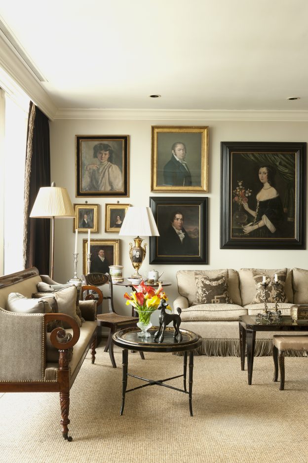 After downsizing from a large home to a much smaller condominium, Atlanta antique collectors Stephanie and Bill Reeves grouped together portraits that had been displayed throughout their house.