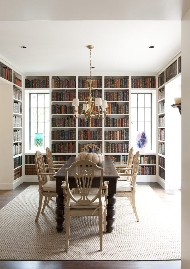 The book includes the dining room of a Federal Revival home in Birmingham, Alabama, where a wall lined with gilded, leather-bound books and two sleek contemporary glass vases adds a warm yet airy backdrop for a heavy, dark-stained English library table. It’s surrounded by light-colored Hepplewhite-style dining chairs beneath an ornate Italian chandelier.
