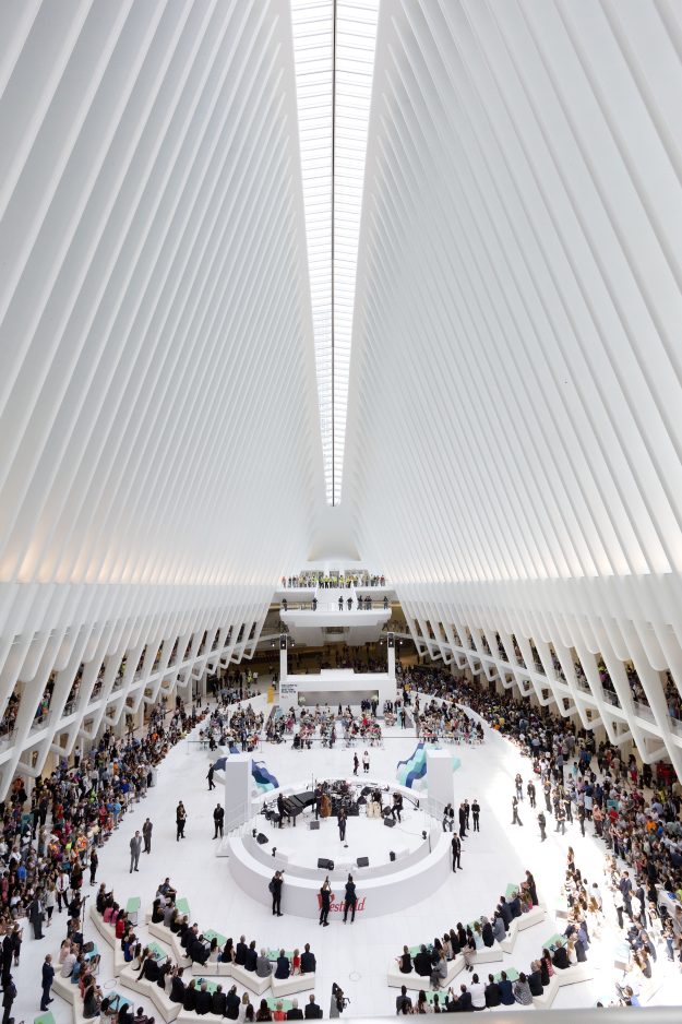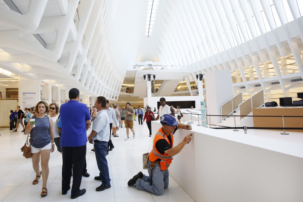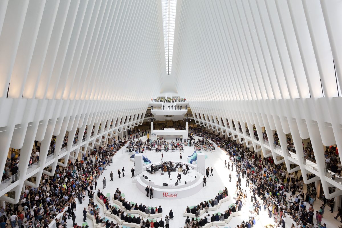 It stretches along a four-block underground network that spans the bases of three office towers. While mostly below street level, light beams in through the windows of the winged Oculus, designed by Santiago Calatrava, that top the transportation hub of 13 subway trains and river ferries. More than 300,000 commuters use it on a daily basis.