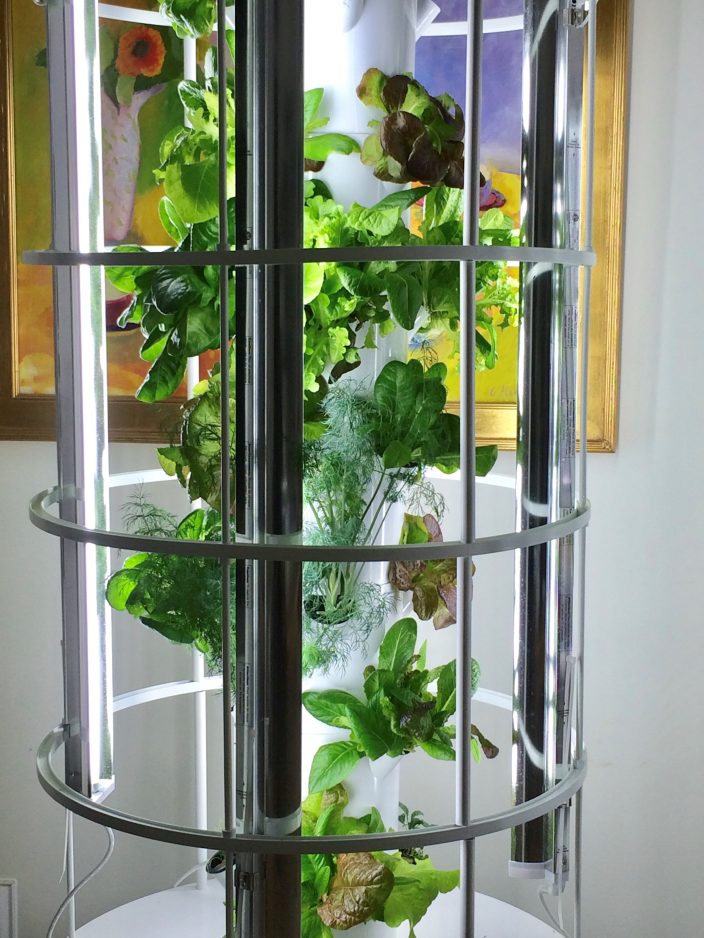 LA Farms’ vertical garden would make a vibrant addition to a sunny kitchen or sunroom. A circulating pump brings a soothing burble of water up and through the tower-shaped planter.