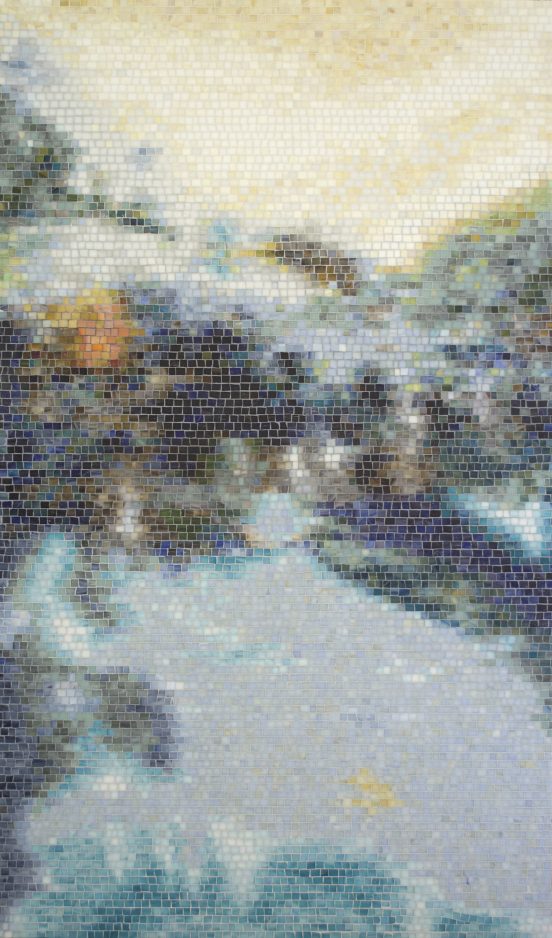 New Ravenna features a Chinoiserie bird-on-branch pattern made of marcasite, mica, pewter and quartz glass. The design was by artist Sara Baldwin of Exmoor, Virginia. Also here is Manhattan artist Gail Miller’s moody “Black Pool” painting of deep eddying water and a storm-tossed sky, rendered in tiny, hand-cut mosaics.