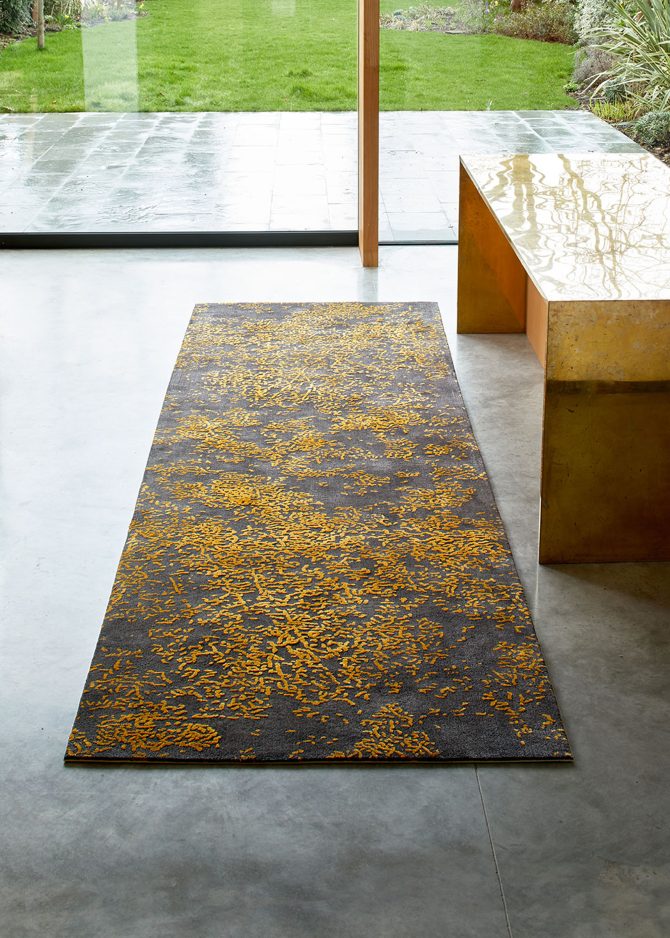 Turkish rug maker Stepevi pixellates bird-wing imagery, which is then loomed into a textural rug in a palette of seven hues. On another rug, blossoms are rendered in gold against a graphite background, suggesting dawn breaking. An embossing technique is applied during the tufting process to create a rich, tactile pile that highlights the pattern.