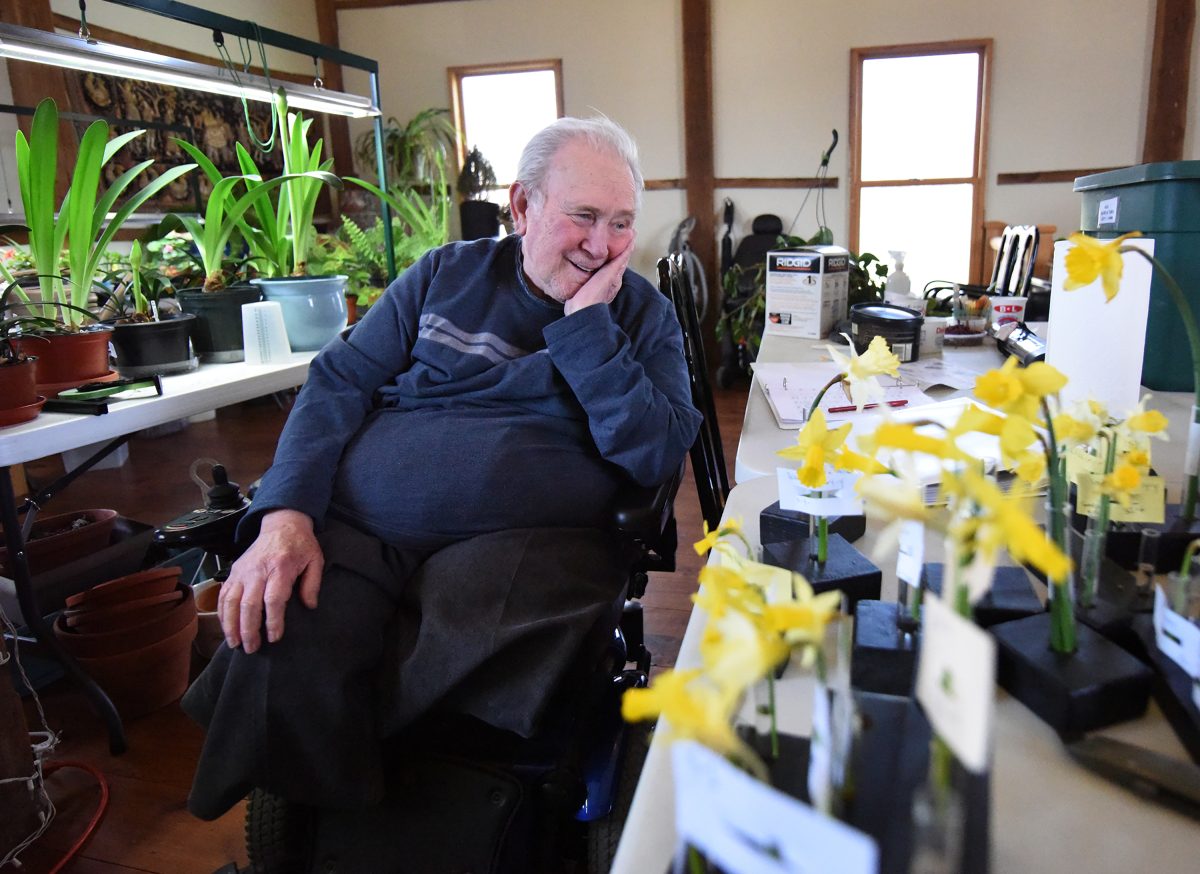 Joe Hamm, holding a daffodil with a name on the stem, got his love of gardening from his grandfather and uncle.