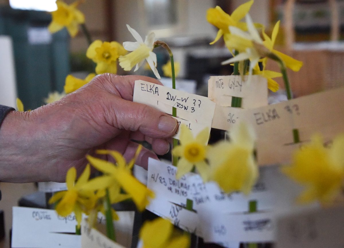 Joe Hamm holds a tag that identifies the type of daffodil. Hamm’s collection includes about 2,000 types of the flower.