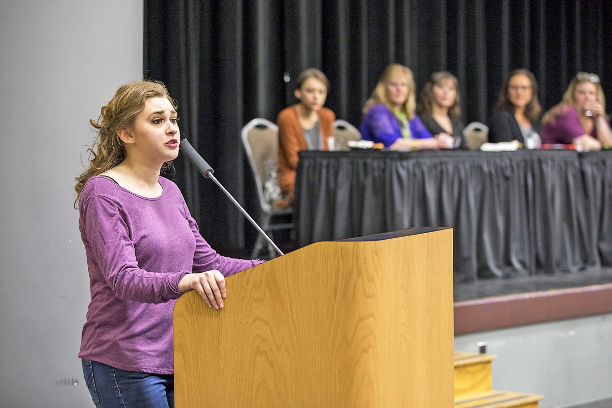 Kayla Grimm, a senior theater student at Cal U., answers a student’s question about themes of domestic violence in the musical “Heathers,” in which she played a leading role. In the background are panelists, from left, Abbey Sager, Elizabeth Larsen, Emily Sweitzer, Elizabeth Gruber and Marnie Hall.