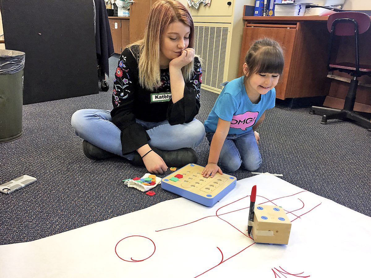 Katelyn Northcraft, left, and Mia Ward wait to see if their Cubetto robot will draw a square. Katelyn and Mia gave the command with the interface board that directs Cubetto.