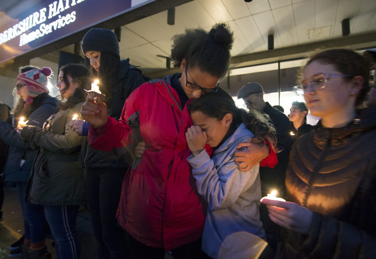 Isabel Smith, left, hugs her friend, Ruby Ashman, during a candlelight vigil Oct. 27 at Sixth Presbyterian Church in Squirrel Hill after 11 people were killed at Tree of Life Congregation earlier that morning.