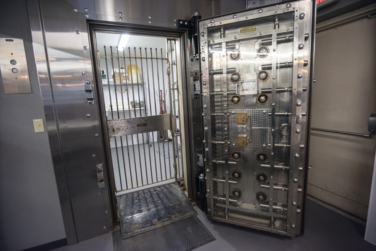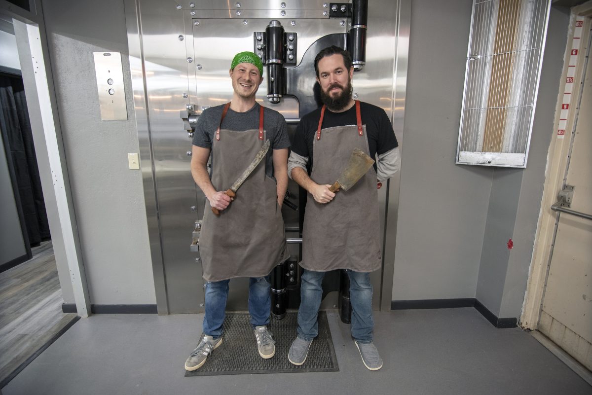 The bank closed in October 2016, but some of its assets – physical in this instance – endure. Its large vault serves as a long-term curing chamber. A small room at the front is a short-term curing area, and a drive-through space is now a walk-in cooler. Cutting is done at a side of the building that is bulletproof.