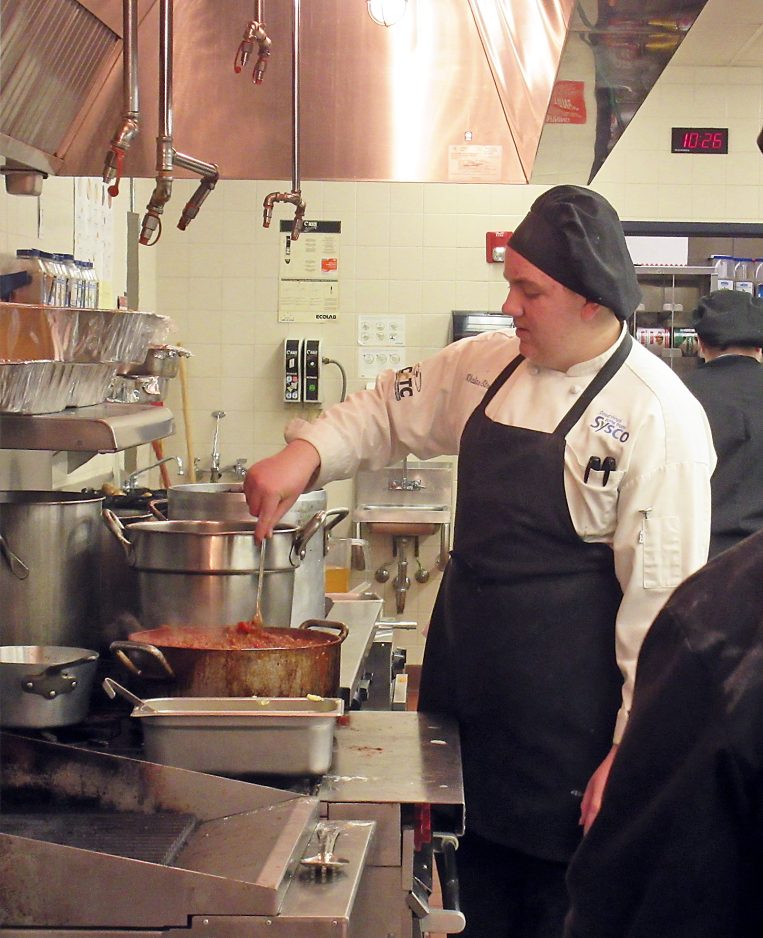 Student Nikolas Strait stirs a pot of sauce Friday morning before the school’s annual Christmas buffet.