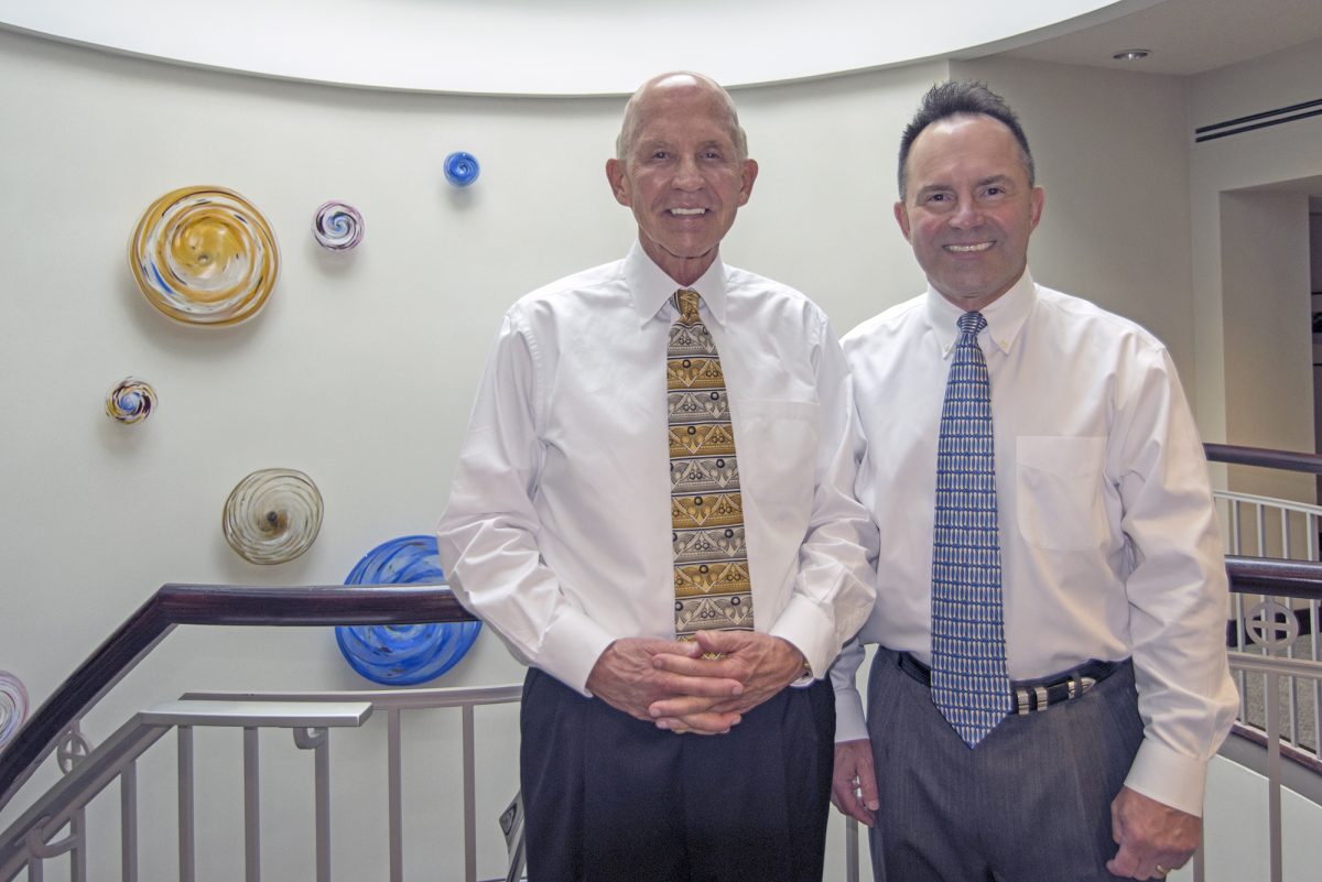 In a photo from 2018, Ed Dunlap, left, chairman and CEO, and son Tim, president and COO of CentiMark Corp. in Southpointe