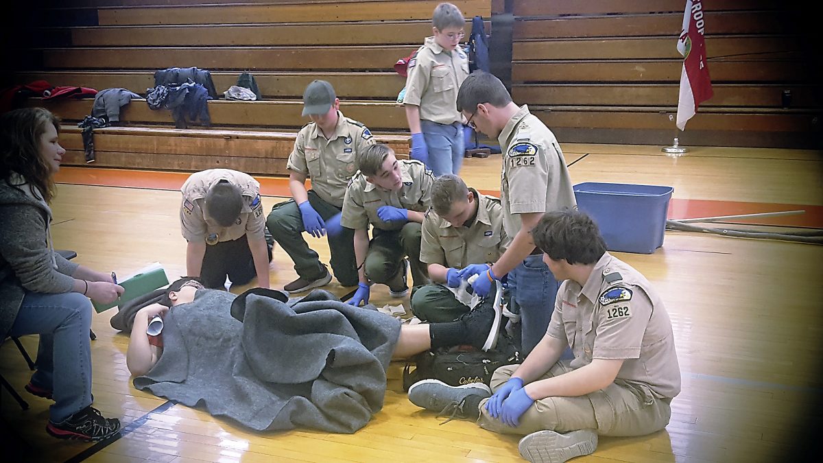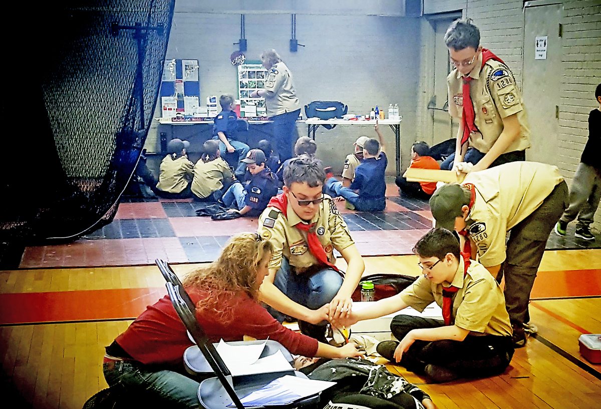 Boy Scouts of America’s General Greene District first aid competition was held Jan. 27 at Waynesburg College. During the annual event, Scouts test their first aid knowledge in 10 scenarios. This year, Scouts had assistance from makeup artists from Douglas Education Center and judges and support from Rices Landing VFD, Clarksville VFD, Stat MedEvac and EMS Southwest. Troops competing included Troop 1005 Washington, Troop 1031 Claysville, Troop 1280 Waynesburg, Troop 1262 Carmichaels, Troop 1168 Rices Landing and Troop 1600 Graysville. Cub Scouts in fourth and fifth grades, Webelos, participated in a first aid training and Girl Scout Troop 51255 from Claysville was also present.