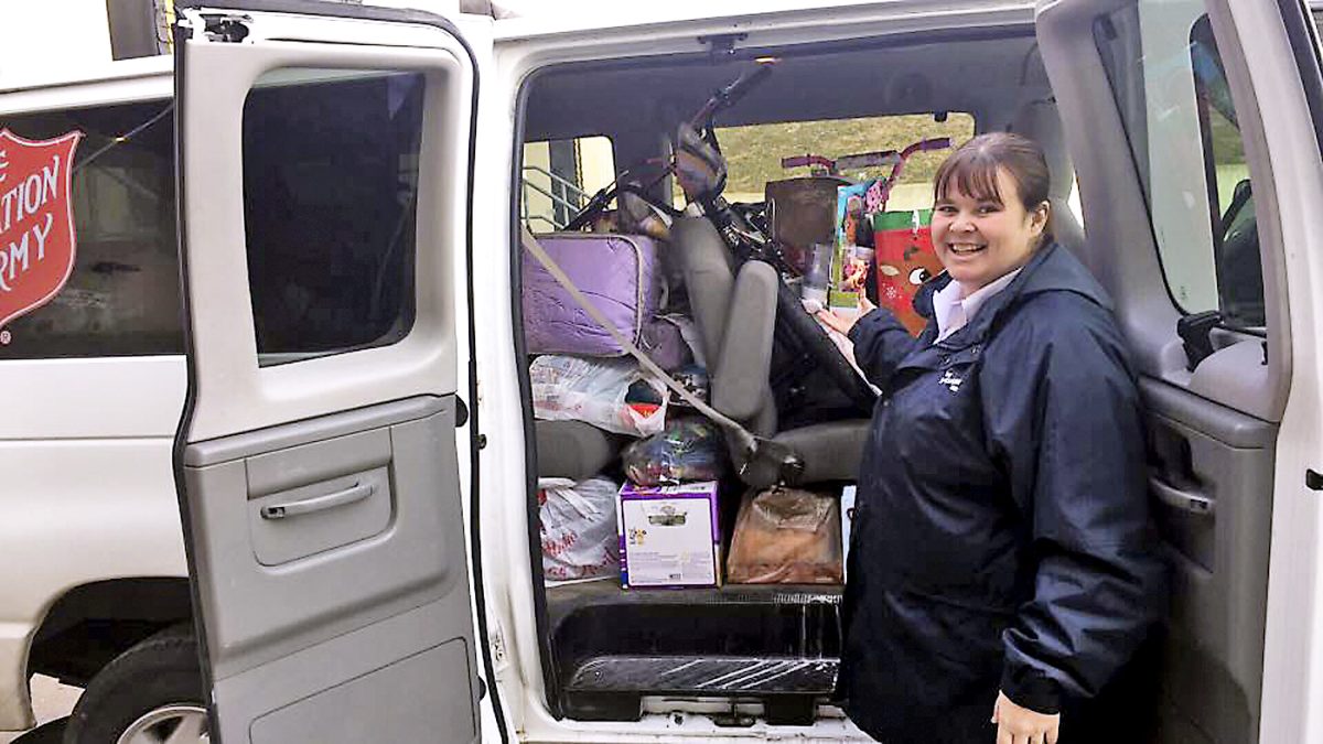 Salvation Army Capt. Amber Imhoff picks up toy donations for the Salvation Army’s Treasures for Children program at Wilfred R. Cameron Wellness Center.