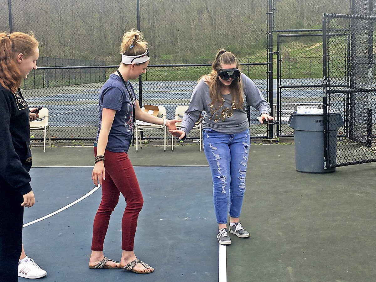 Teacher Melissa Opalanko helps student Emily Morris, who wears goggles that simulate drinking alcohol while trying to walk a straight line.