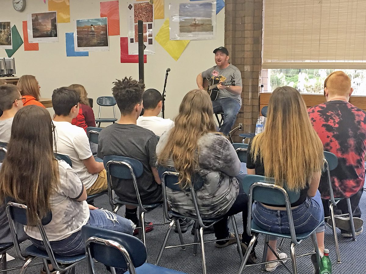 Avella resident and country singer Aaron Margaria performs in the Trinity Middle Schol library.