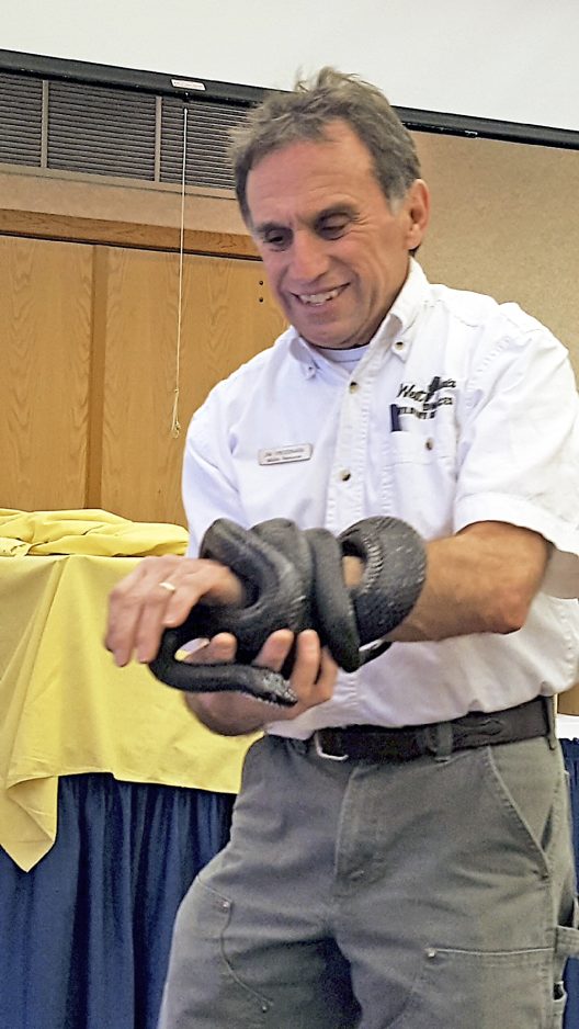 Biologist Jim Fregonara holds a black rat snake during a presentation on snakes of West Virginia.