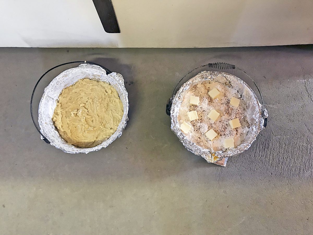 Banana bread, left, and caramel apple cobbler before being put in the fire to cook