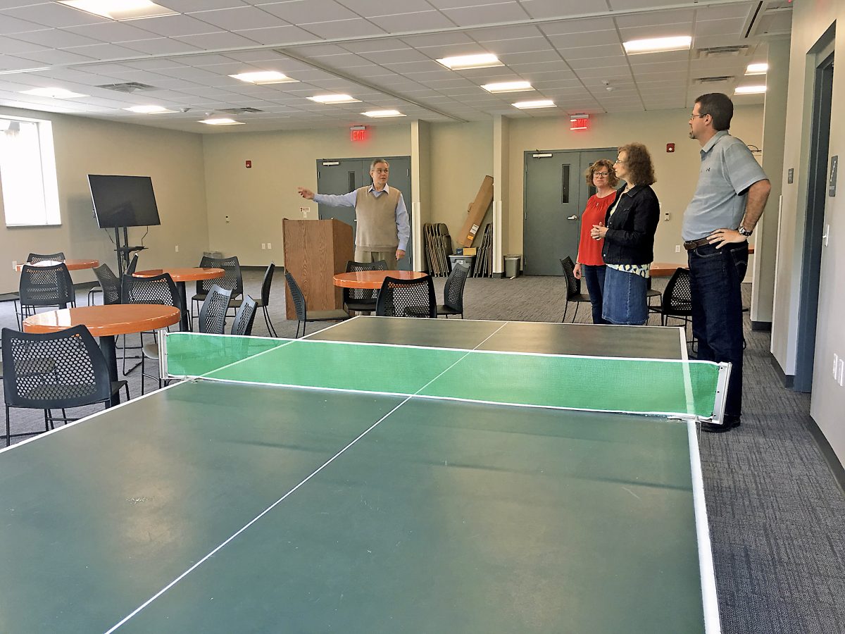 The Rev. George Garancosky; Kim Ahrens, office assistant; Gayle Stahlman, office manager; and Dr. Jeffrey C. Diedrich, discipleship pastor, take a look at the new multipurpose room, where the church youth groups congregate and which can be divided by room partitions.