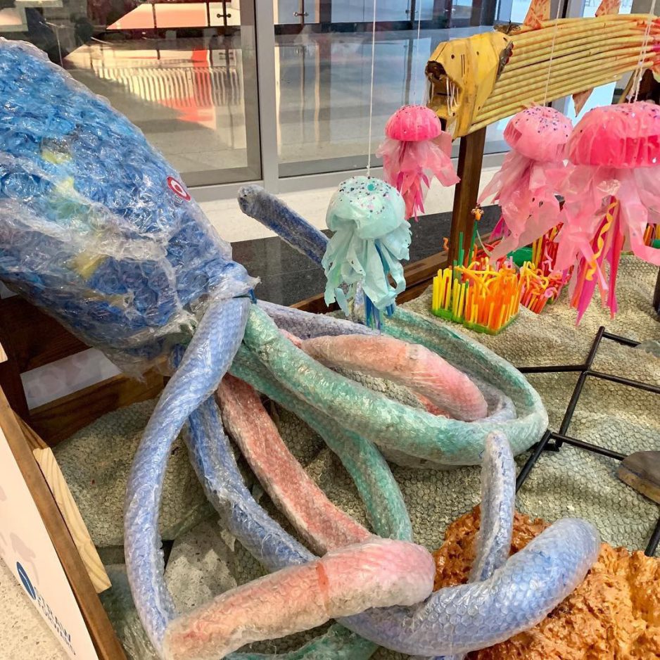 The 25,000 plastic straws used in Straw Forward were collected every week by Sustainable Pittsburgh’s restaurant program and the Shift Collaborative, a Pittsburgh marketing and communications group. They were then washed, dried, counted and sorted based on their color and size. The installation shows a seascape with coral reefs and industrial-fishing netting, along with such marine life as an octopus, jellyfish and barracuda. A seagull soars over the surface of the straw-manufactured “water.”
