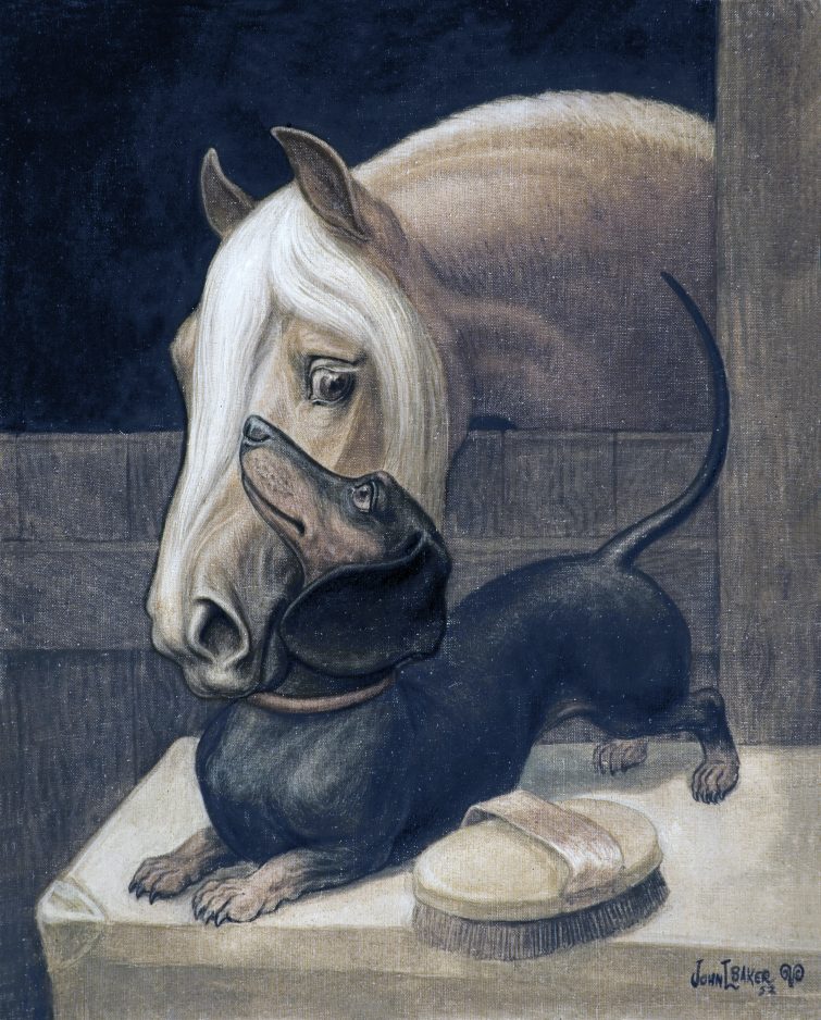 Undeniably prolific, Baker’s family has cataloged more than 500 paintings that are in the area or in the family’s possession. The exhibit at Citizens Library includes a rendering of Christ’s Last Supper that, unlike other paintings that depict the scene, has Christ’s disciples seated around a table. Baker’s interest in animals found expression through paintings of deer, ducks, dogs and, of course, horses. He also painted landscapes, portraits, nudes and scenes of Europe.