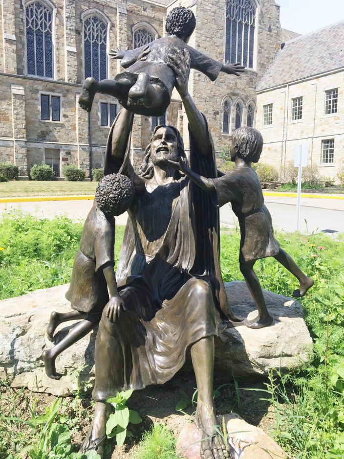 His work stands about eight feet, depicting Jesus Christ seated on a large rock, holding one child overhead and three children reaching to him. The sculpture is at the center of a grassy circle filled with wildflowers, and has been there since July 26.