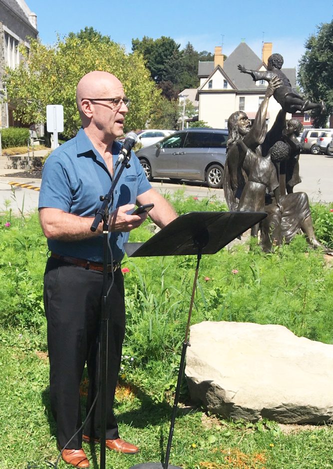 The artist had a triumphant homecoming Sunday outside Church of the Covenant in East Washington. Cottrill spoke during a dedication of his statue, “Let the Little Children Come to Me,” outside the Presbyterian Church along East Beau Street, across from the Washington & Jefferson College campus.