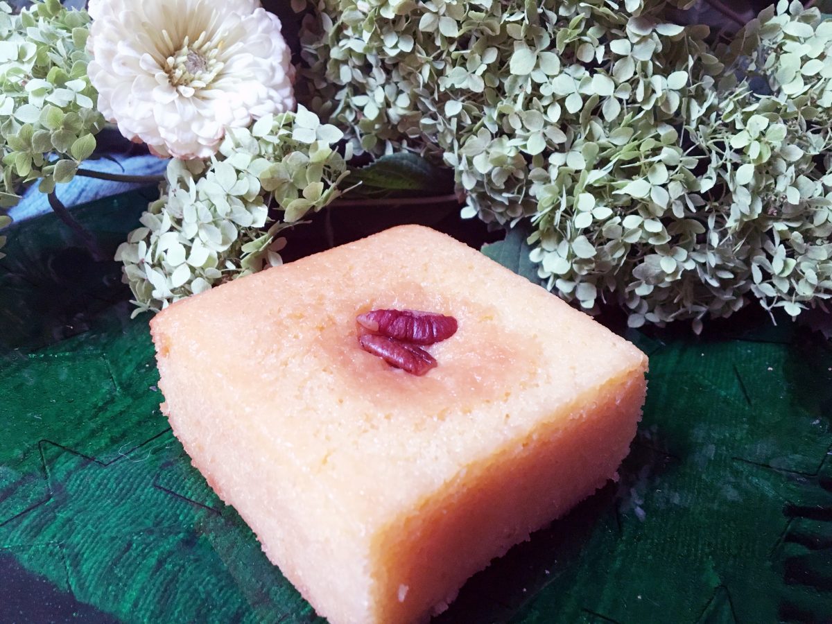 The base is semolina flour, which produces a dense crumb similar in texture to American cornbread. Radwan drenches the baked product with a lemon-sugar syrup and tops each square with a pair of walnut pieces.