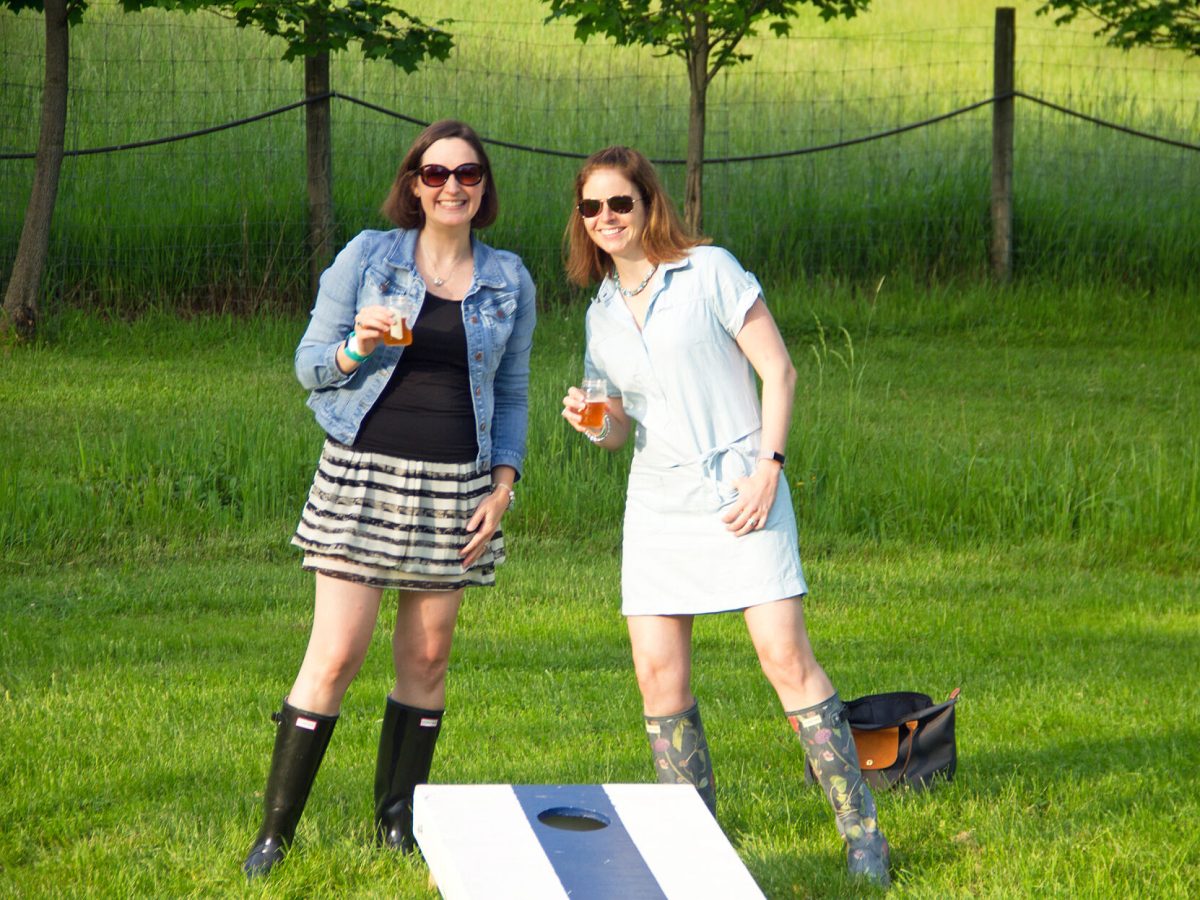 Stephanie Hasselwander, left, and Cristen Hughes participate in a game while enjoying a previous year’s Gilfillan Farm Barnyard Beer Benefit.
