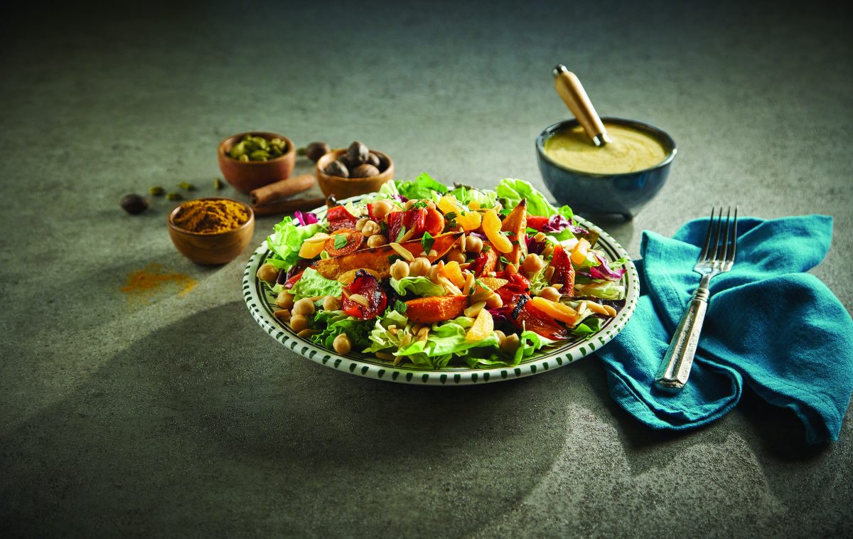 Veggies roasted with aromatic spices served on Fresh Express 5-Lettuce Mix are drizzled with lemon tahini dressing in this Moroccan Roasted Vegetable Salad, a delicious vegetarian way to turn a bland meal into a bona fide delight. With green leaf lettuce, red leaf lettuce, butter lettuce, romaine and radicchio, the mix of greens offers a bold combination of textures and flavors for those who love variety and color.