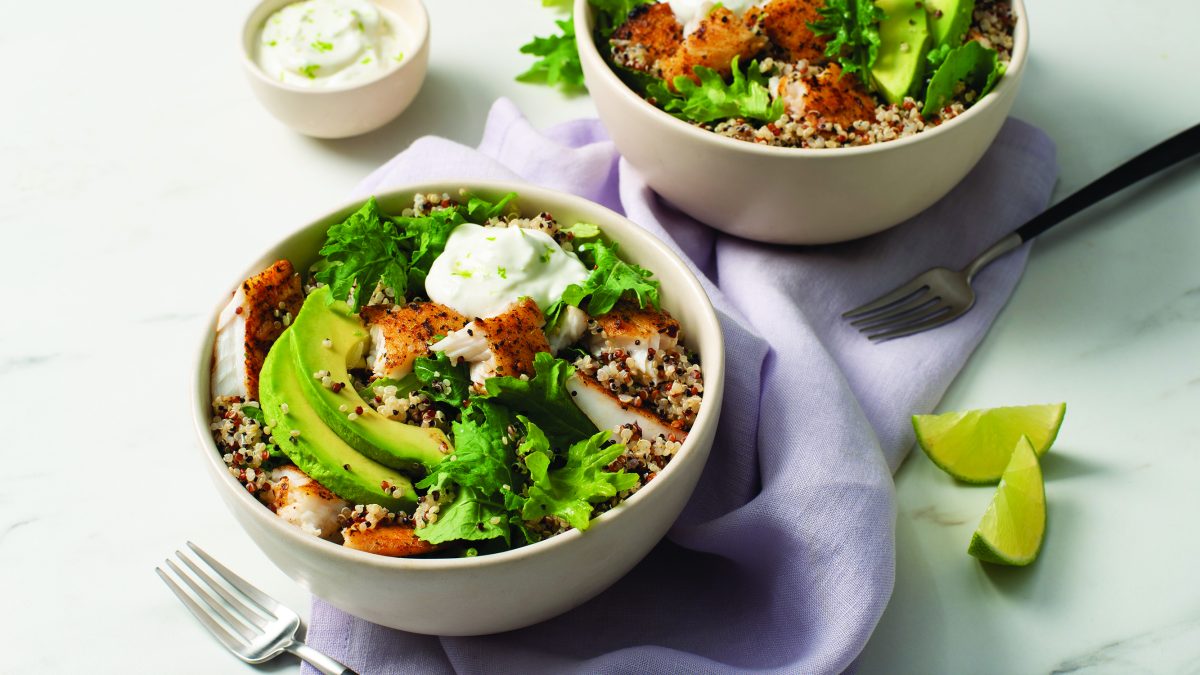In medium bowl, toss quinoa with kale. Divide between four bowls. Top each with fish, sliced avocado and dollop of yogurt and lime crema.