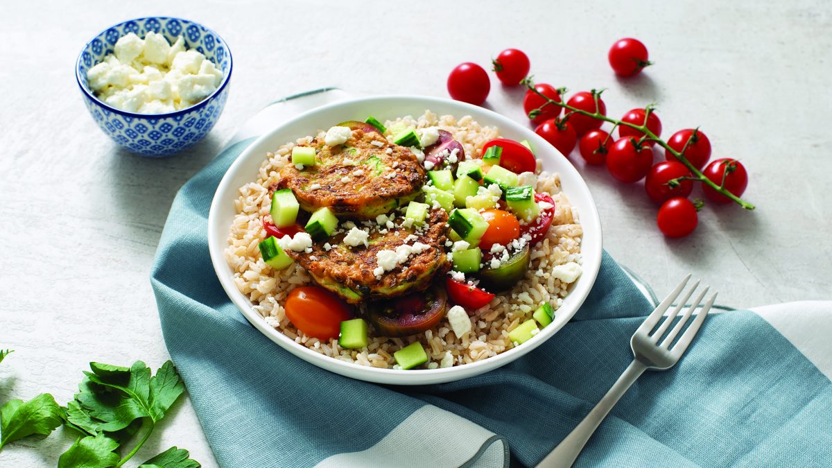 Mediterranean Rice Bowls with Zucchini Fritters